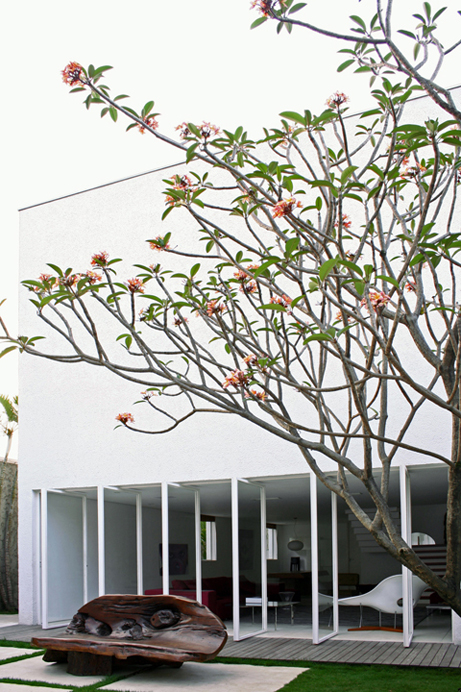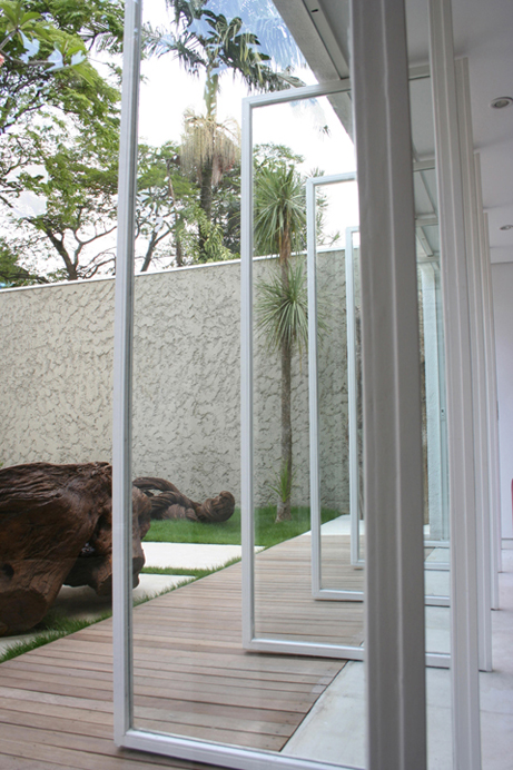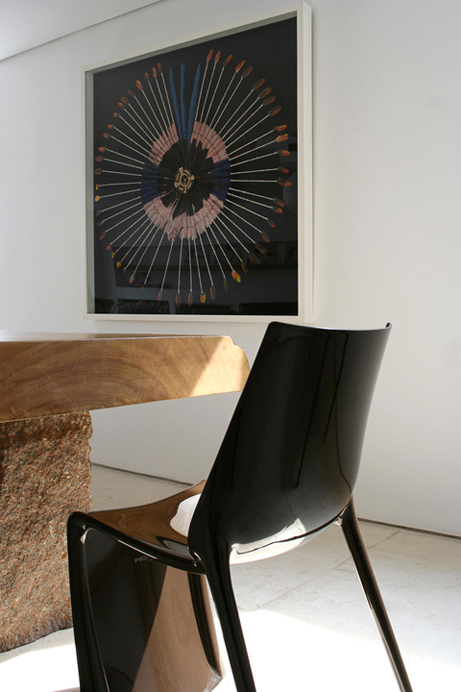 Outro desejo atendido foi o de ter uma residência com ar litorâneo, onde os moradores pudessem dormir e acordar bem. Para isso, o arquiteto projetou um jardim integrado ao living por meio de portas picotantes. “Os pontos altos deste projeto são duas características do meu trabalho: o concretoaparetnte na estrutura e o grafismo”,explica. A beleza das peças em madeira foi ressaltada pelo minimalismo do trabalho de Calio. O objetivo foi atingido após um estudo que identificou como as peculiaridades do trabalho da designer poderiam ser integradas à nova residência. “Fazer pesquisa com cliente e chegar ao íntimo para realizar o sonho dele é uma das características do meu trabalho”, afirma.