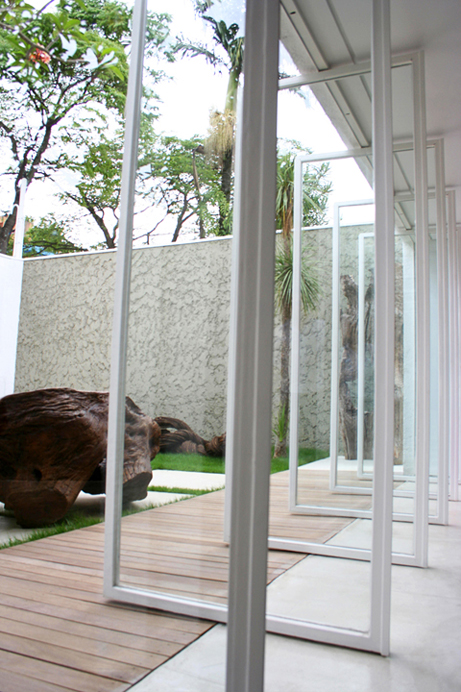 Uma caixa branca envidraçada que funcionasse como vitrine. Este foi o pedido de uma designer de móveis feito ao arquiteto Francisco Calio, que criou um projeto para destacar as peças em madeira reciclada-bancos, aparadores, mesas de jantar, entre outros-desenvolvidas pelas cliente.