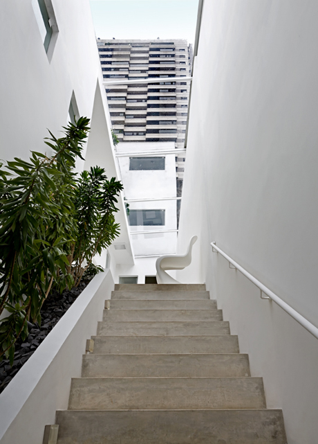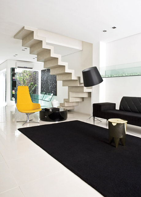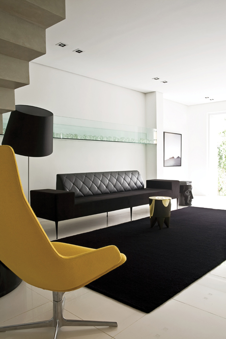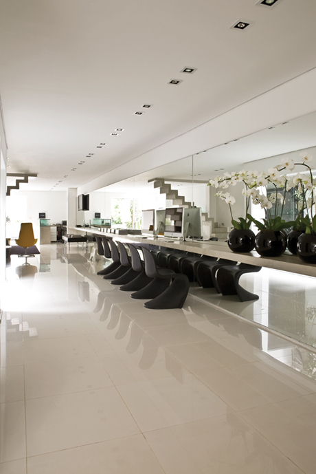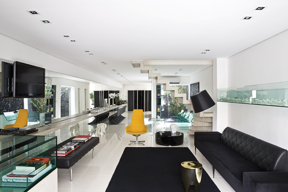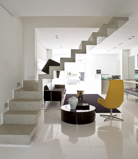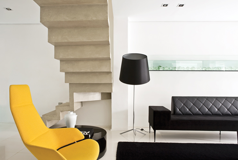 Outro ponto importante foi a utilização de grandes vidros translúcidos que captam a claridade, duas escadas em concreto aparente dão acesso aos pavimentos superiores.