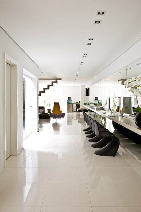 No primeiro piso o teto retrátil em vidro e estrutura metálica branca contemplam a arquitetura arrojada e a circulação de ar desejada.