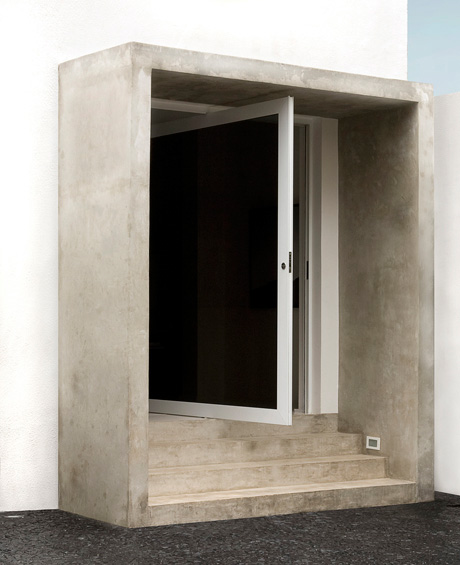 Na fachada optei por uma volumetria arquitetônica com textura branca, onde uma caixa central em concreto aparente acopla a porta pivotante da entrada em vidro Eboni com estrutura metálica, no piso externo mosaico português preto e paisagismo de Verri-flores.