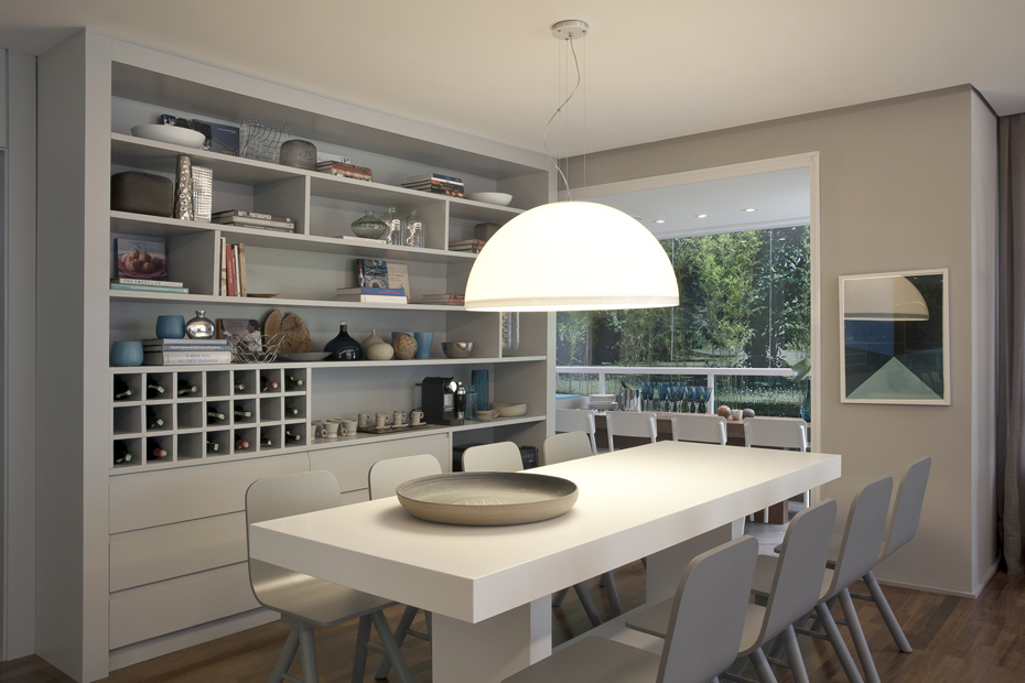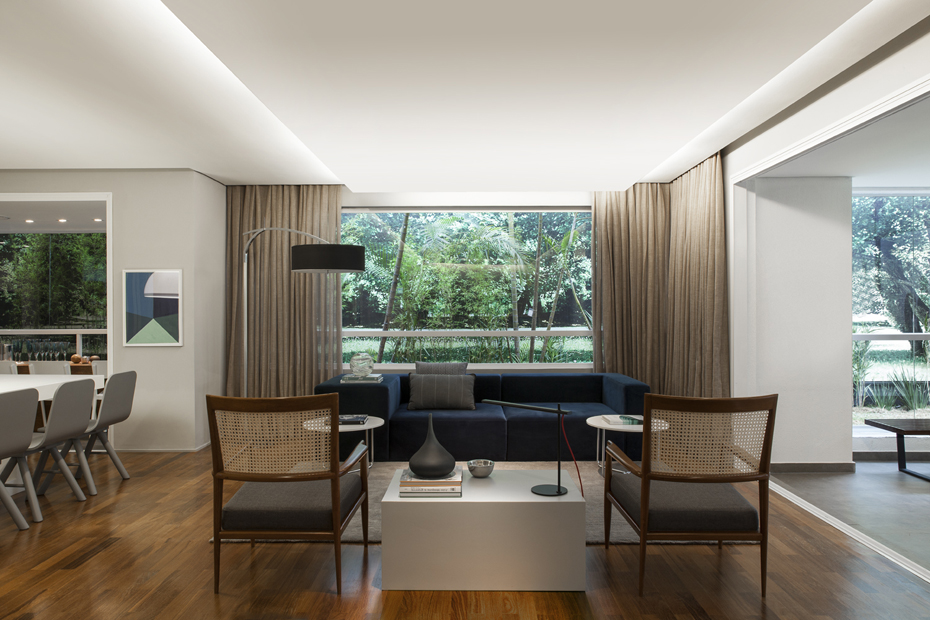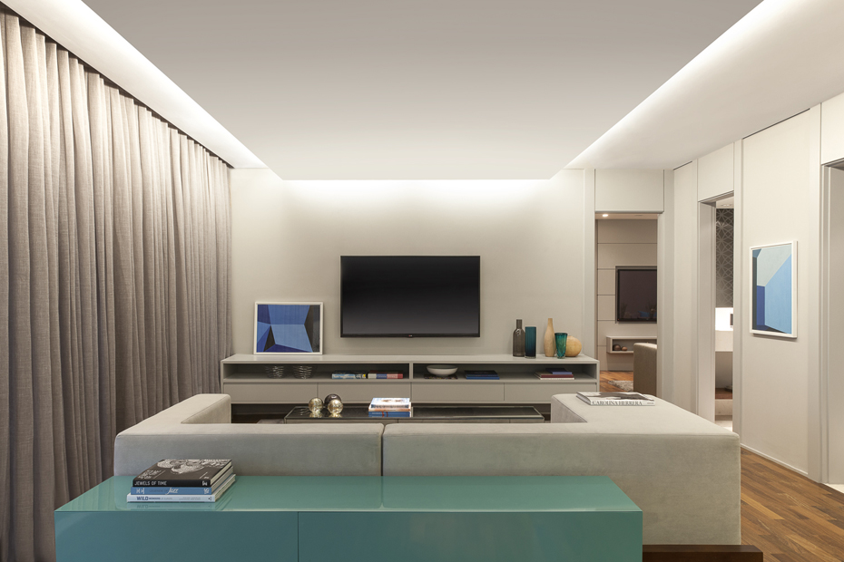 Neste projeto, criamos um layout exclusivo para uma família com dois filhos adolescentes, com muitos espaços para circulação, iluminação indireta, e um piso de madeira para aquecer. No mobiliário planejado, projetado por Calio, portas de correr, vidros e lacas dão beleza e conforto ao mesmo tempo, no mobiliário de design utilizamos uma cartela de cores em tons de cinzas e azuis que fazem um contra-ponto no piso de madeira e mobiliário vintage. Cortinas de linho, abajures, pendetes, completam esse décor.