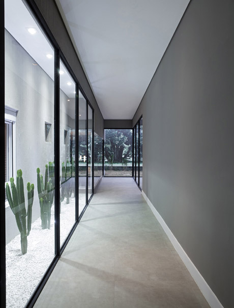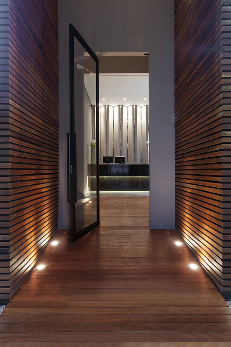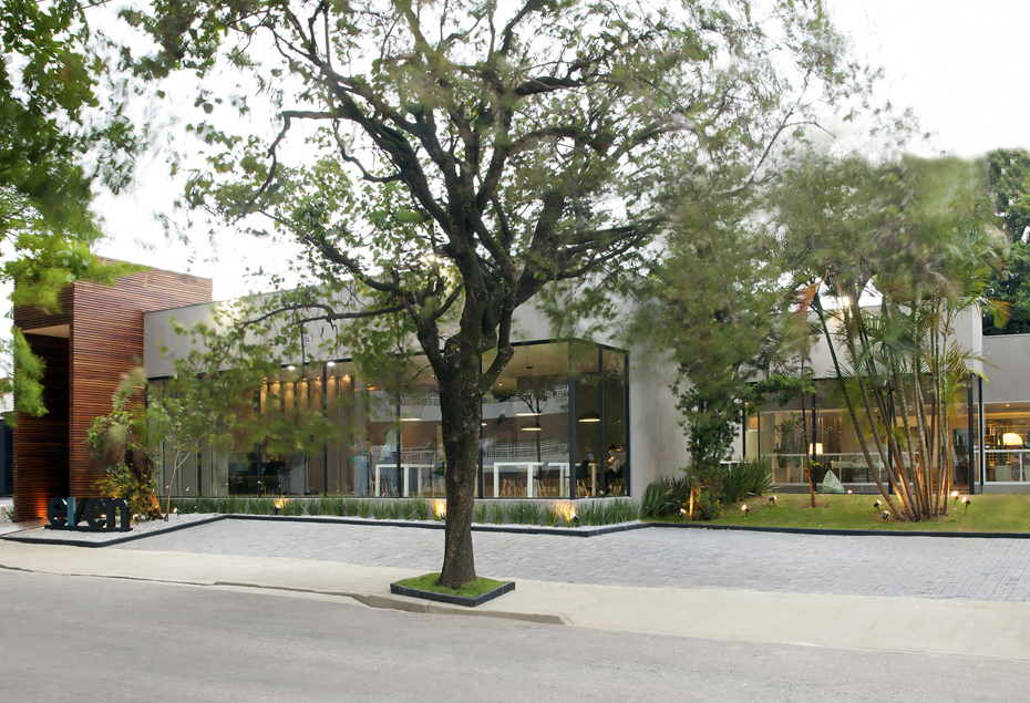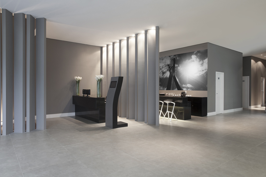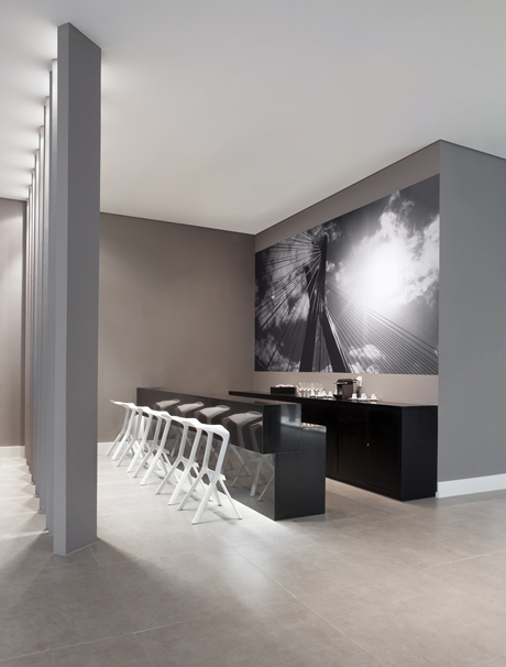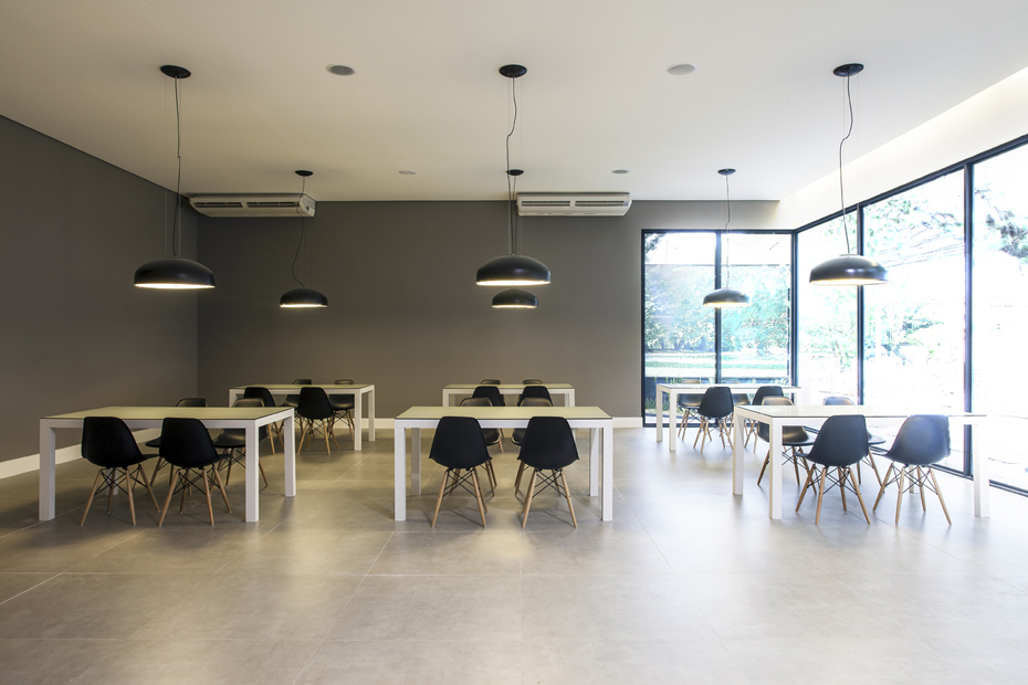 Setorizamos recepção, café, escritório, banhos, copa e cozinha. Já no atendimento, mesas simétricas, com dimensão exata para apresentação do projeto e mobiliário de design consagrado. No luminotécnico, além de luminárias embutidas pontuadas, pendentes sobre as mesas dão o equilíbrio exato e arrematam este projeto único.