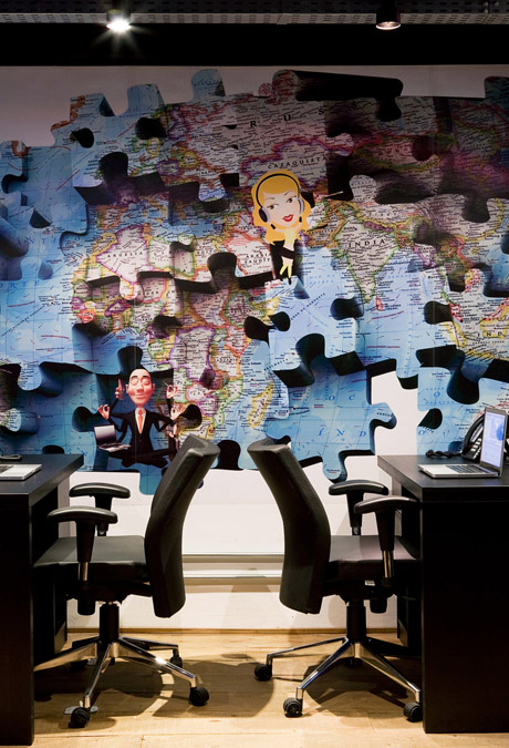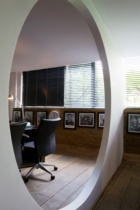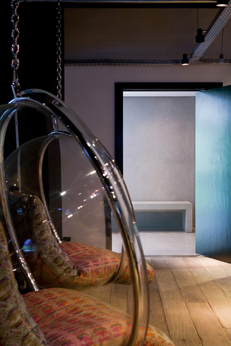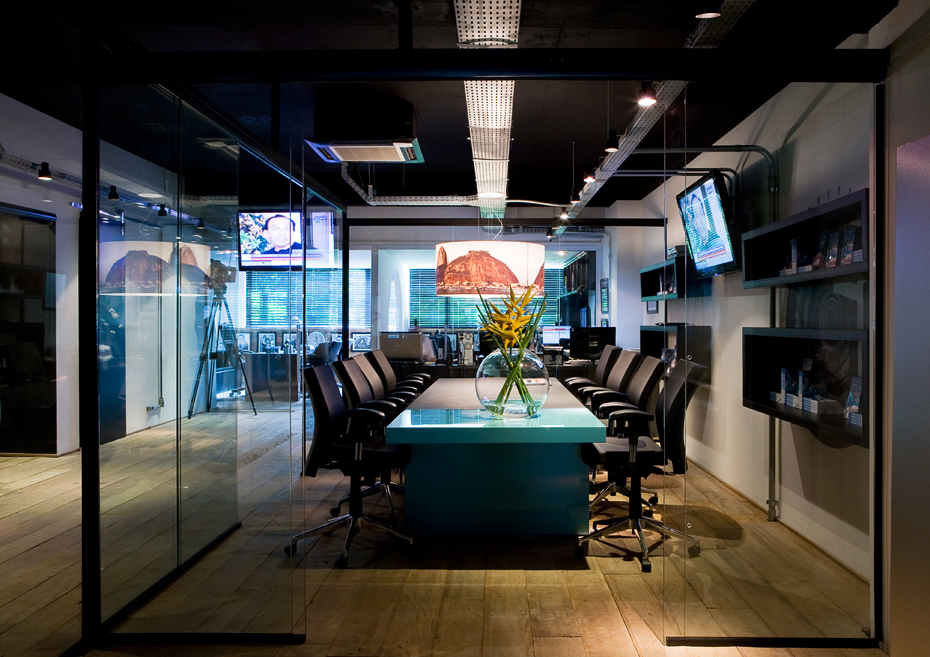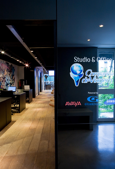 A fachada foi recoberta por vidros Eboni da Guardian. No piso madeira de demolição e no teto pintura preta.