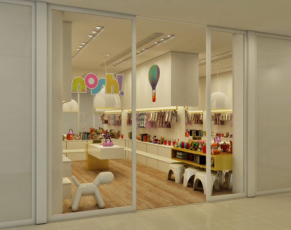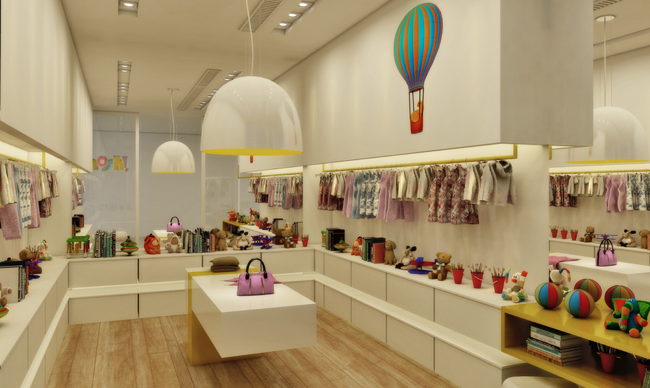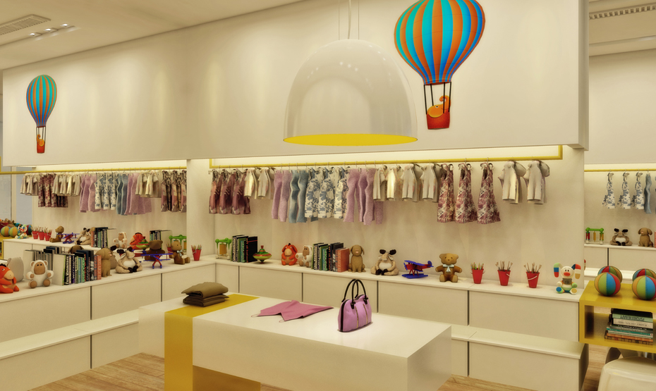 A loja infantil localizada no shopping Pátio Higienópolis em forma de box, possibilitou que Calio utilizasse espelhos laterais para dar amplitude e modernidade ao ambiente. O eixo central ganhou mesa flutuante com detalhe amarelo.