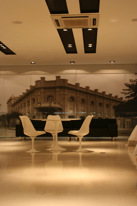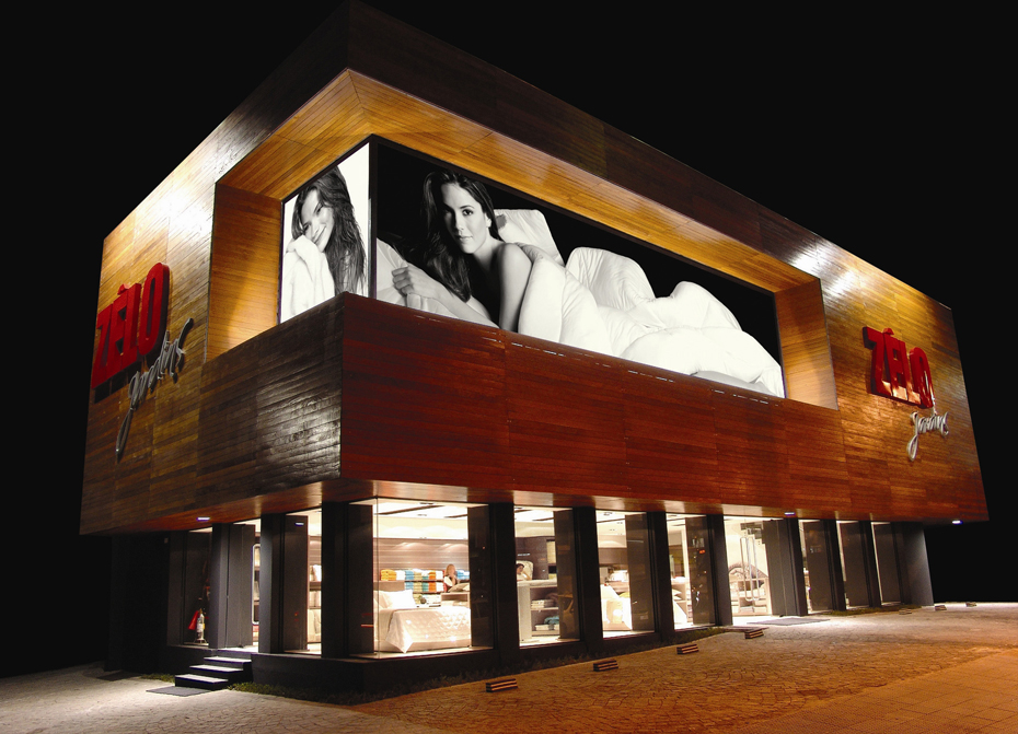 A solução dada pelo arquiteto foi utilizar uma estrutura na cor preta na parte inferior do edifício e posicionar na fachada uma caixa de madeira cumaru suspensa com um grande nicho, onde foi fixada a foto da primeira loja da rede. Calio diz que a idéia foi contar a historia da empresa na fachada, mostra a historia do grupo circundada pela arquitetura minimalista criada para a edificação