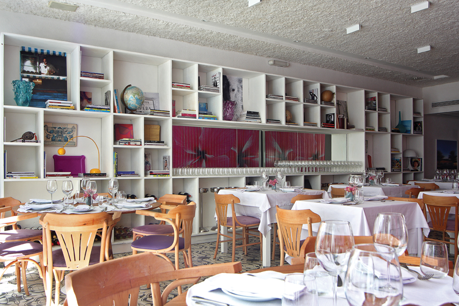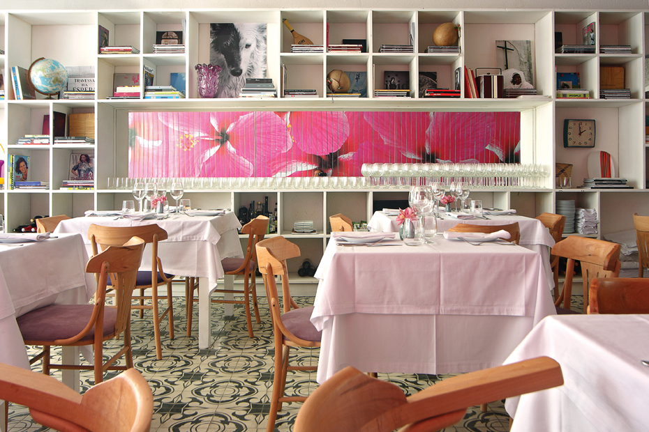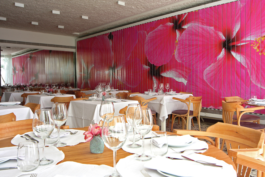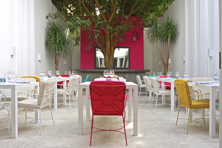No mobiliário utilizou mesas e cadeiras, optando por colocar lado a lado clássicos do design com outros modernos, usando madeira natural para aquecer o ambiente. Na tapeçaria, usou tons de roxo que fazem parte da cartela de cores criada pelo profissional, tecidos em mousseline off white, dando toque mediterrâneo, descem do teto fazendo a divisão entre o salão principal e a área externa. Ao fundo o teto transparente e retrátil, nesta área complementam este ambiente, o designer criou um bar em concreto aparente ao redor de um grande fícus com uma parede pink e no mobiliário um toque sutil de poltronas turquesa, pink, vermelha e amarela.
