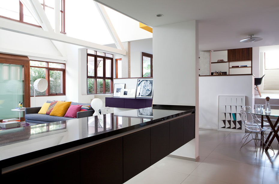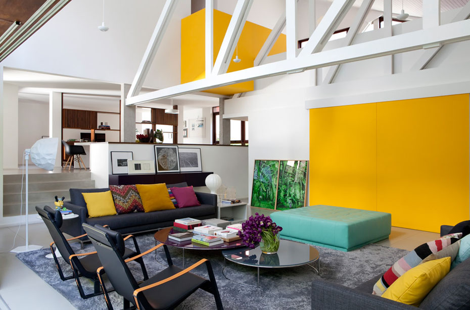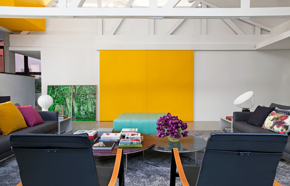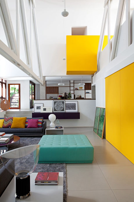 O destaque fica por conta de um grande painel amarelo, que divide o living da cozinha gourmet.