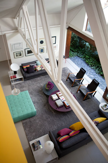 Os ambientes com pé direito duplo e grandes tesouras são um diferencial neste projeto.