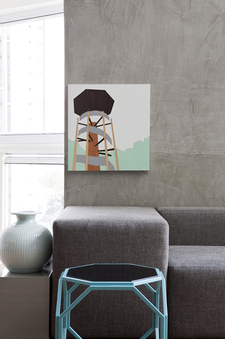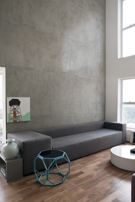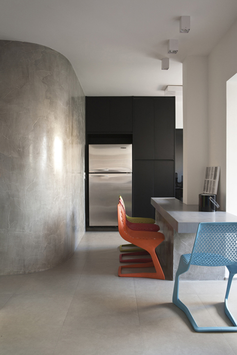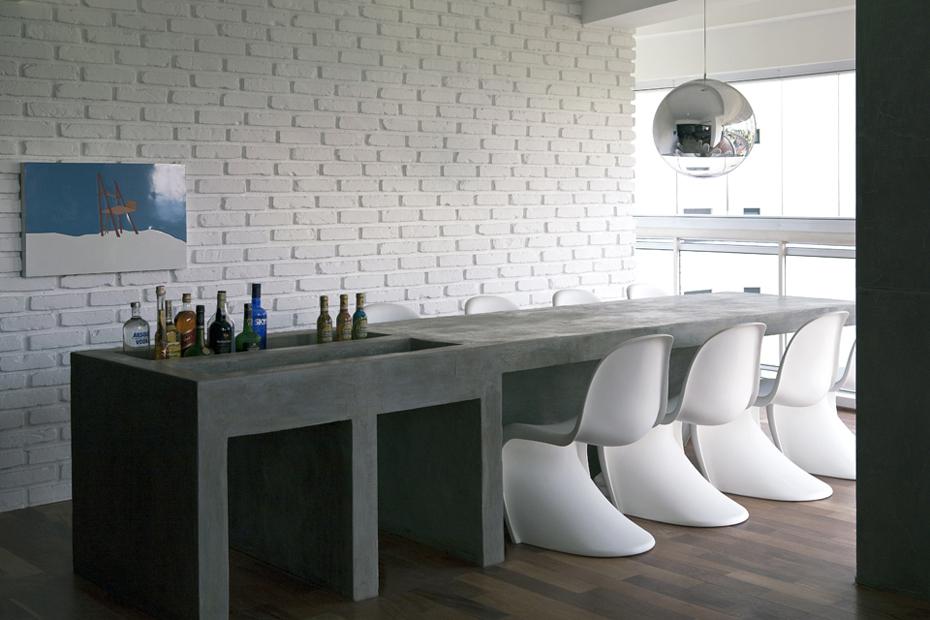 O desenho do mobiliário fixo e mesas em concreto aparente são do profissional e executado pela A Caixa Marcenaria e sobre esta mesa luminária espelhada Ton Dixon e cadeiras Phanton tudo Miniloft alem dos estofados em tecidos de alfaiataria na cor cinza. Com obras de arte da Galeria Virgilo dos artistas Ana Brengel, Ana Sario, Tatiana Ferraz e Fernando Burjato, tela a oleo da Entreposto valorizam os ambientes deixando –os com ares cosmopolita sutil e elegante. Nos banheiros utilizei corean cinza nas bancadas marcenaria em laca branca espelhos e vidros dividindo o ambiente, já no quarto aparece novamente concreto aparente na cabeceira da cama para apoio do abajur e fotografias, na roupa de cama Blue Gardênia e tapete Casa Fortaleza Vitrine.